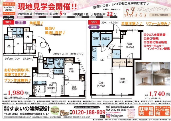 新着物件| 価格 | 1,980万円 1,740万円 | 専有面積 | 55.89㎡ 44.05m² |