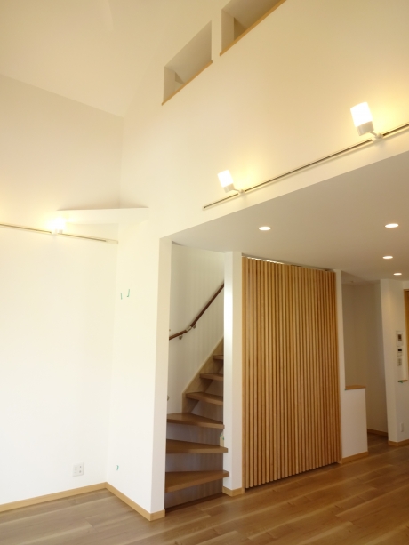 小屋裏収納に上がる階段はストリップ階段にし、木製のパーテーションを設け、とても素敵なお住まいになりました。ご主人様と奥様でとてもこだわった素敵な空間です。